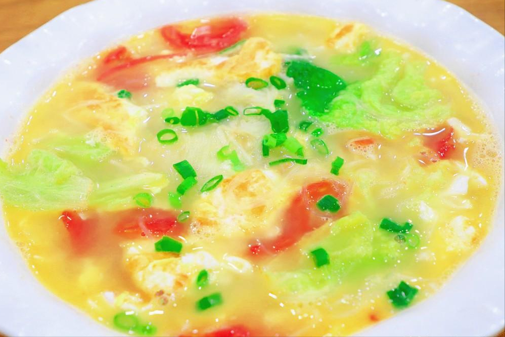 4.然后倒入白菜叶、把粉丝控一下水放入锅中搅拌均匀,再倒入西红柿薄片煮30秒,加入一点香醋去除一下鸡蛋的腥味。
