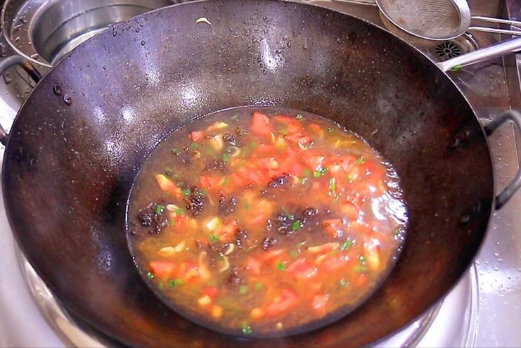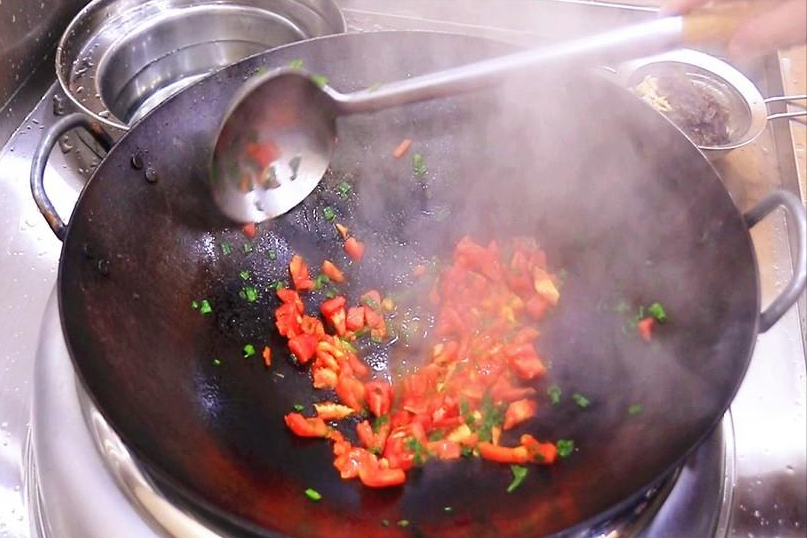 2.锅内烧油、油温五成热的时候,放入葱花爆出香味,倒入番茄丁继续翻炒,用勺子背把番茄压碎、充分炒出里面的红汁