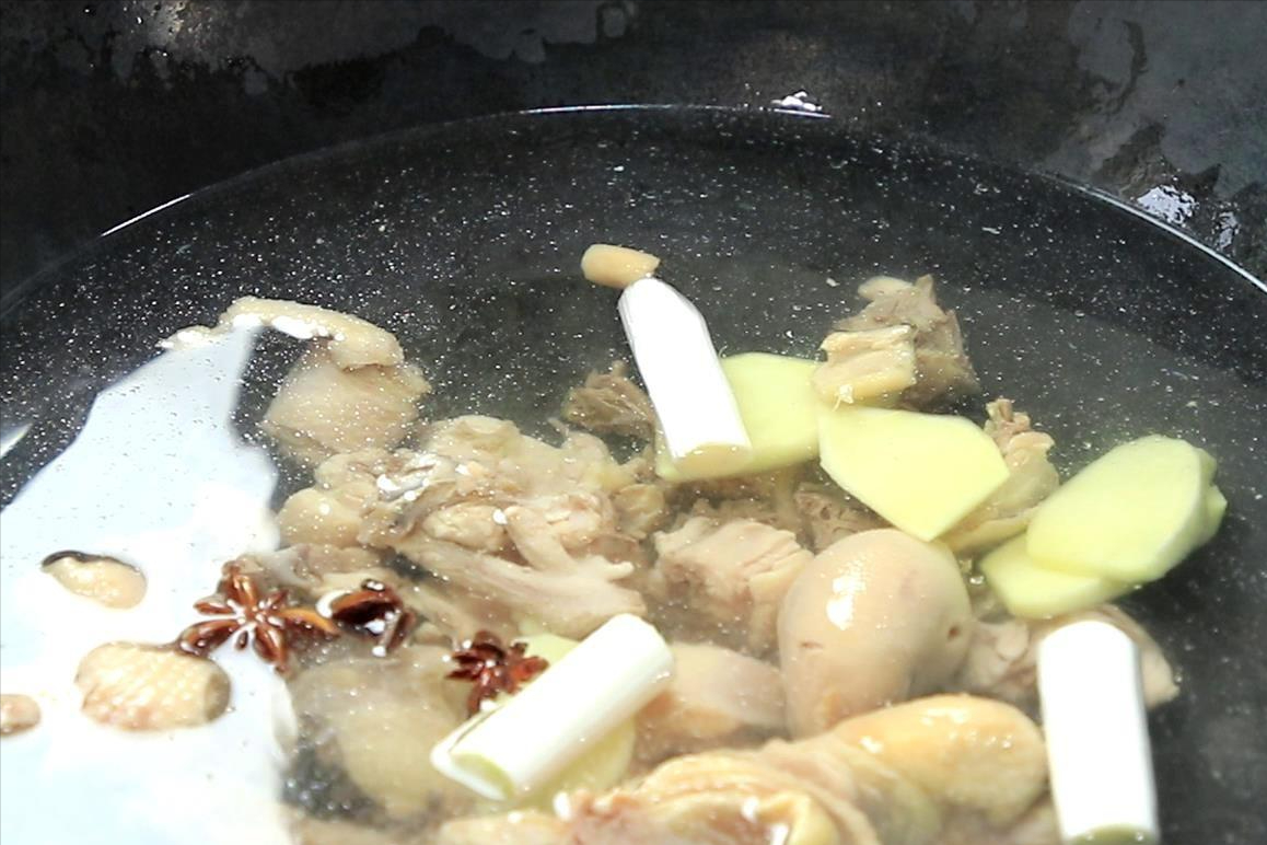 3.锅内烧水放入鸡肉,倒入葱白、生姜和八角,不喜欢八角的可以不放,加入食盐2克、料酒5克、盖上锅盖,小火煮10分钟左右。