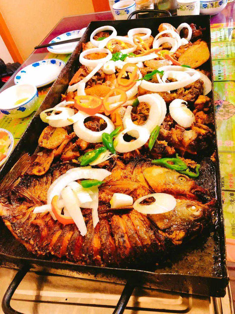 当一份海陆空,被几个人一起抬到面前时,你的感官绝对会得到强烈的刺激。80-150厘米长,40-60厘米宽的盘子,满满一槽子烤肉,极具视觉冲击力。残余的余温,让盘子边缘的肉,卷起边儿,冒出滋滋渗油的声响。鱼肉的鲜香、羊肉的浓郁、鸡肉的醇厚,混着生洋葱的辛辣,交织成一味特殊的馥郁香味,简直是听觉与嗅觉的盛宴。