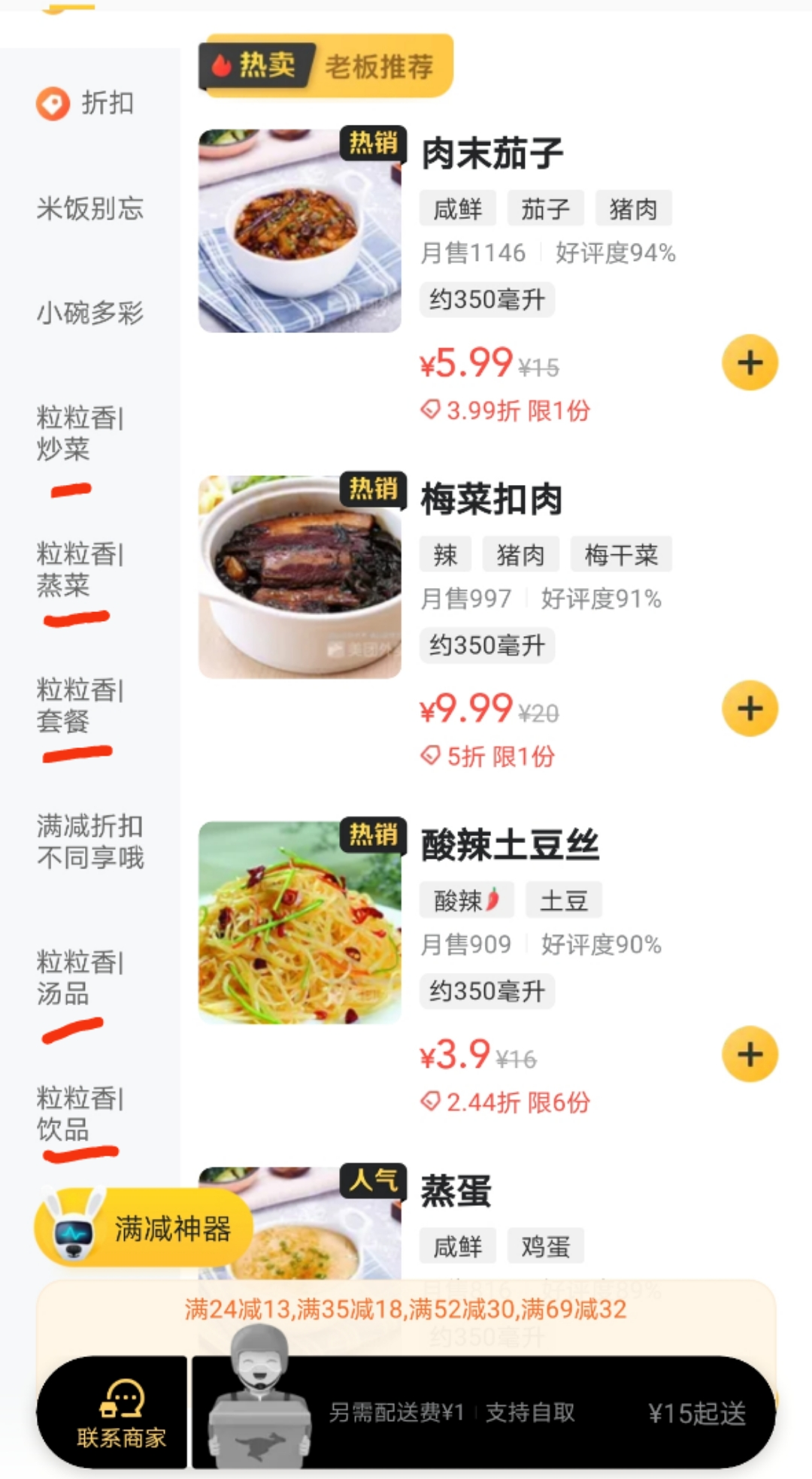菜品宽度:菜品的种类多少、分类有多少(满足消费者的功能需求,比如下图的菜单宽度:炒菜、蒸菜、套餐、汤品、饮品)