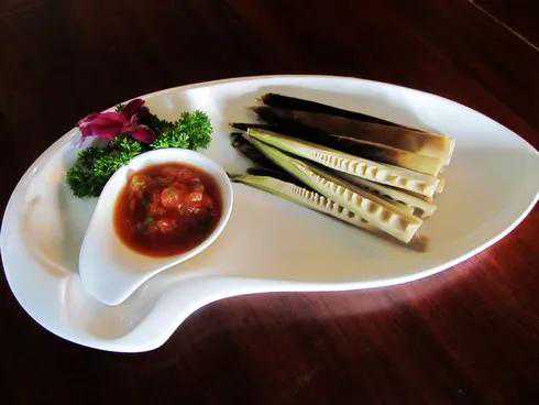 10.南咪手剥笋南咪手剥笋:是傣味中最常见的一道美食,手剥笋:又称带壳笋,是浙江杭州临安区的特产,可开袋即食,可配上傣族特色酱“南咪”一起食用。