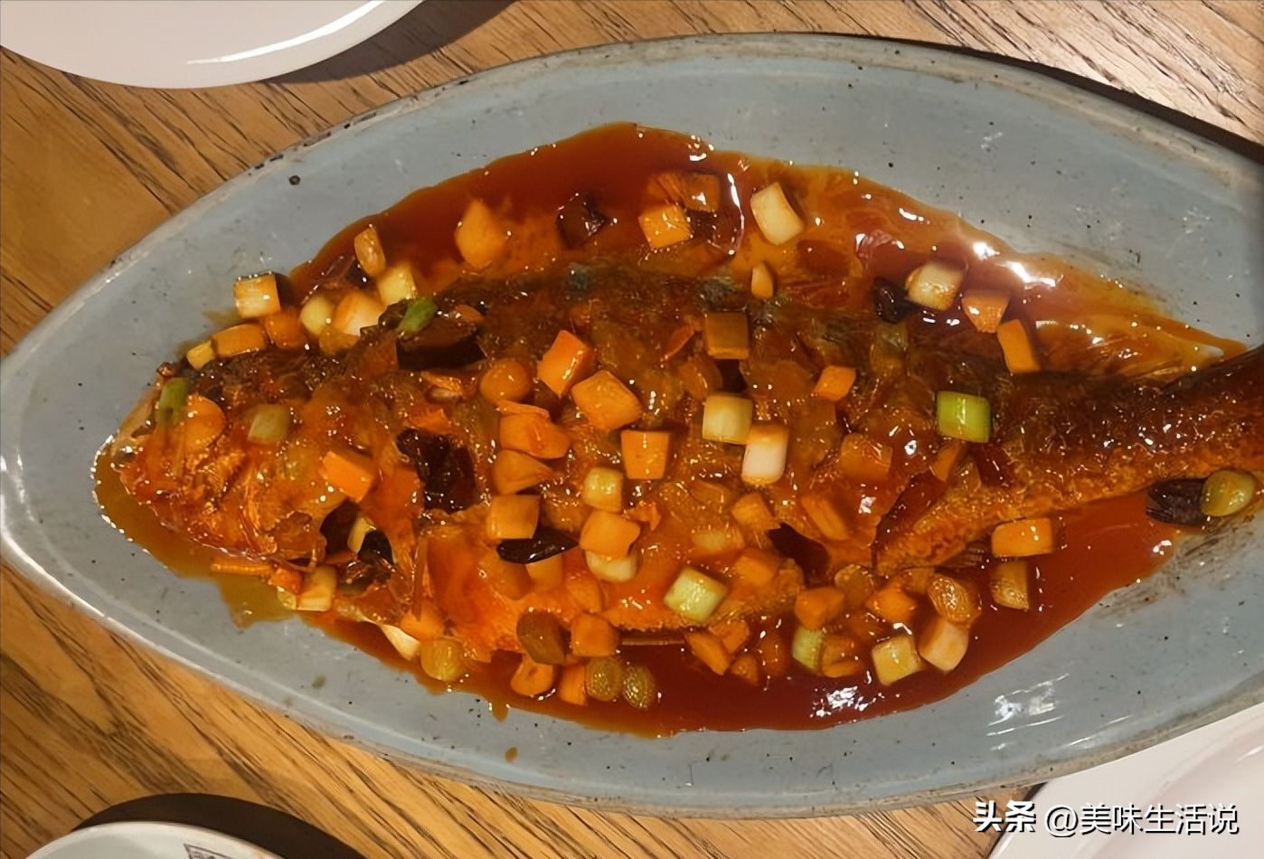 酸甜带咸的口感,大黄鱼的肉质很嫩,炸的火候恰到好处,搭配的辅料很多,有五花肉、笋、香菇、胡萝卜丁等等,用来下饭也不错。