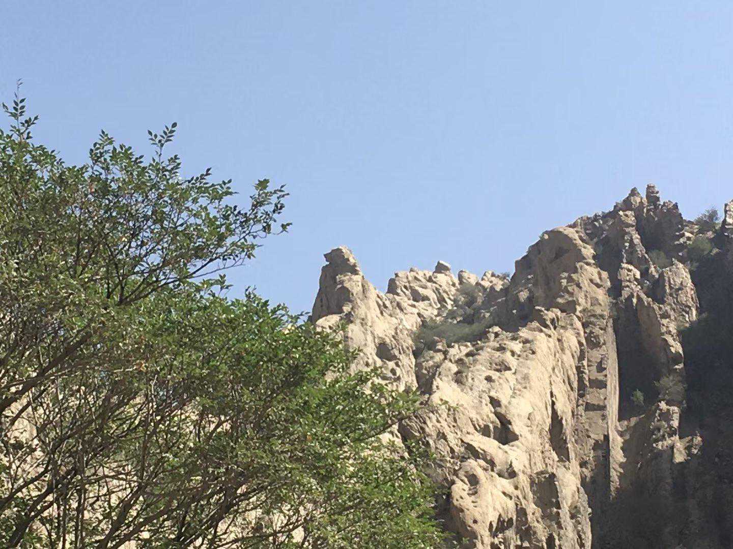 不远处我们停下了脚步,“专家”同学开始为我们指点迷津。在左上方的山顶上有两个紧挨耸立的石柱相对,从山下看去,仿佛是一对情侣在彼此的倾诉衷肠;又好似他们站在高山之巅在俯视着每一个进沟的人们,迎来送往。让前来这里的人们不再孤单,不再寂寞。站在山下,仰视着这对情侣,不知道是为他们的坚贞所感动,还是为他们日夜守护所动容,大家都为此发出阵阵的感叹。这让我联想起阿诗玛,同样是一个形象的石柱,却有一段凄美的爱情传说,而贺兰山只有战争残酷的痕迹吗?