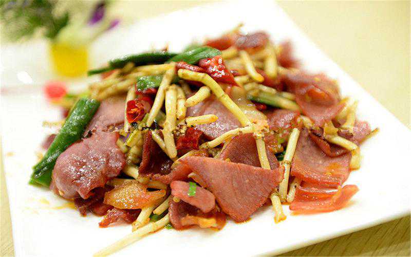 说到贵州的特产,不能不提一提腊肉。贵州腊肉因其独特的风干腌制方法而深受当地民众喜爱。很多人拿起一块腊肉就能直接啃饱肚子。不过,本地人更爱将腊肉和时蔬搭配着吃,发挥食材本身的鲜美。折耳根炒腊肉便是其中著名的代表菜式。折耳根,又名油麦菜,是黔菜中常用的时蔬之一,口感类似菠菜,更加脆嫩。选取最肥美的五花肉卤制成金红色的腊肉,切碎与折耳根翻炒,间或加入一些蒜末、辣椒调味,香辣中透着肉香,又有时蔬的清新,可谓是腊肉美味的又一种打开方式。