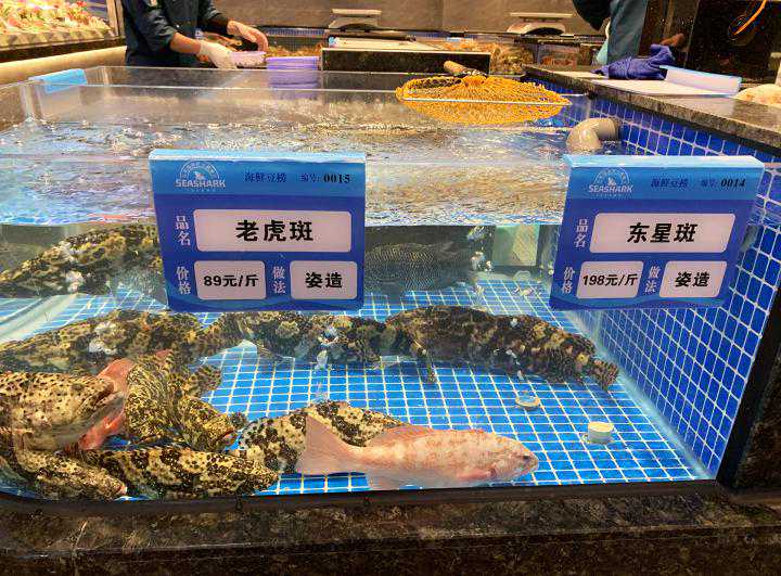 还有128元一斤的珍宝蟹,198元一斤的东星斑,12元一只的竹蛏王,89元一斤的老虎斑,象棋般大的澳带8颗一份,65元,而在西餐厅里,两颗就要一百多元。