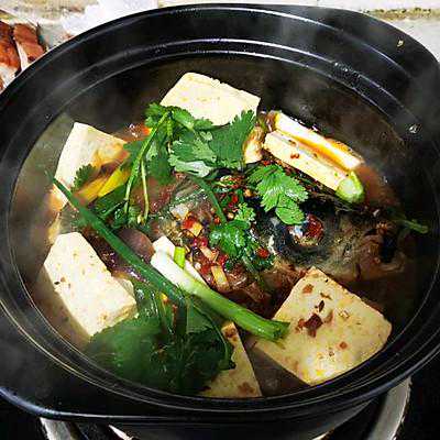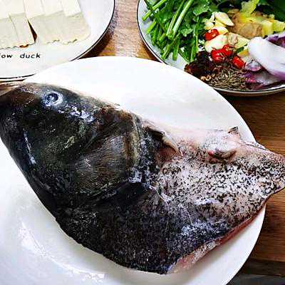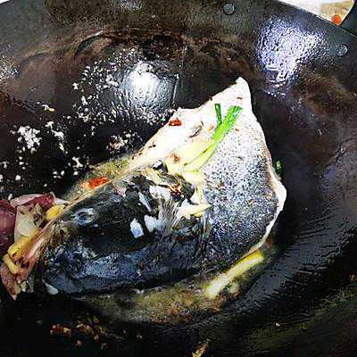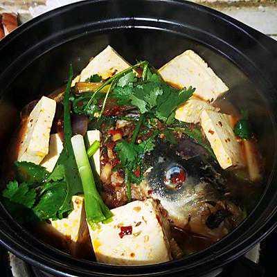 简介买了一个大鱼头,一半剁椒鱼头,还有一半做一个在农家菜吃过的鱼头煲。By厉小厨用料大头鱼鱼头750蒜30g老姜50g葱2根豆瓣酱1茶匙生抽1茶匙黄酒1/2勺红辣椒适量老豆腐1块做法步骤1、葱姜蒜,香菜,洋葱,小米辣,八角花椒茴香。2、老豆腐切片。3、鱼头。4、煲底刷油,豆腐一半煎一下。5、起油锅,炒辅...