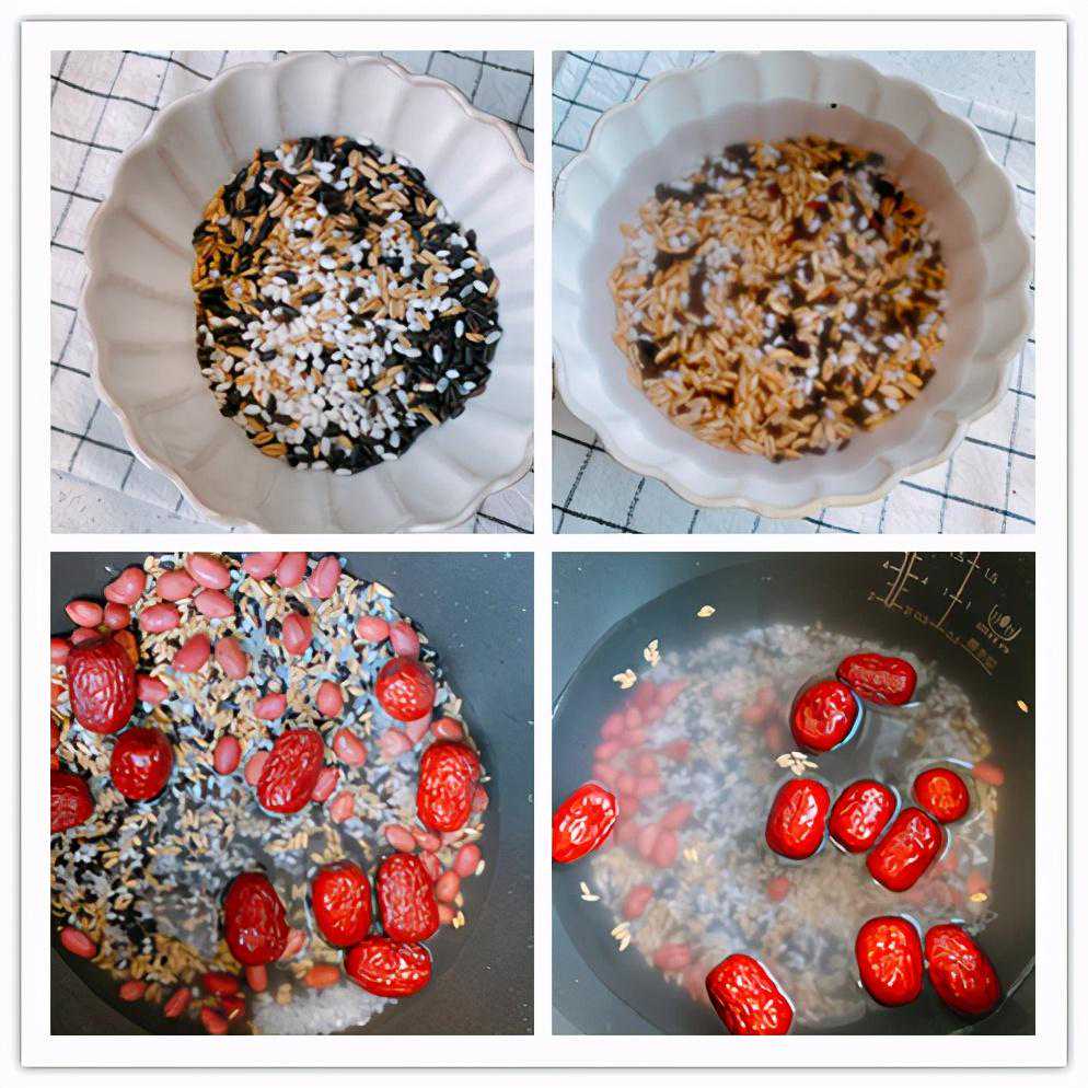 【原材料】大米30g、黑米30g、红皮花生30g、燕麦米30g、糯米30g、红枣适量;