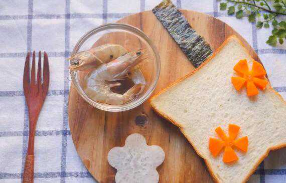 食材:鲜虾30克,胡萝卜10克,土司片1片,海苔片1片