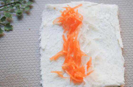 10.把压好得吐司平铺在案板上,把准备好的胡萝卜丝和白萝卜丝用筷子夹在吐司上。