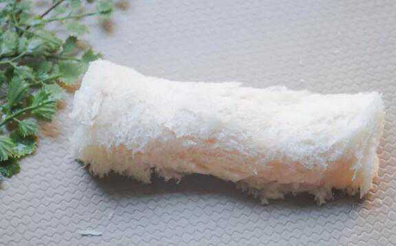 12.用吐司将食材卷在一起,边边的地方可以用点白开水来粘在一起。