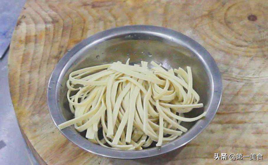 3.准备豆腐皮,通过改刀的方式切成丝。(豆腐皮又叫千张,超市就可买到)