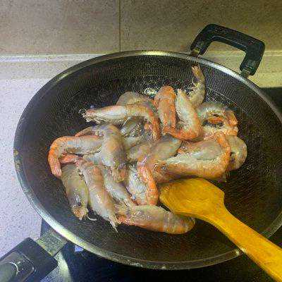 2、锅内倒入油,多一些,将控干水分的大头虾倒入锅内爆炒,待大头虾颜色变红捞出