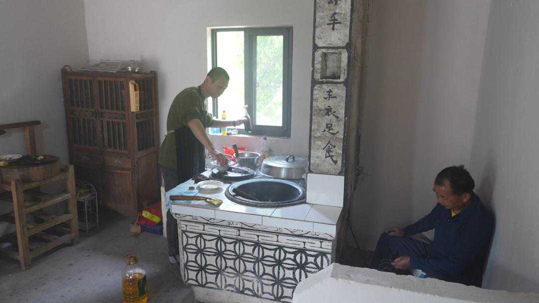 上午,在浦江镇汇中村,村民彭巍正在土灶土锅上忙着烹饪春菜,而段老伯则在一旁忙着生火添柴。