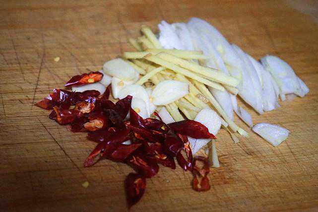 2、切适量葱丝、姜丝、蒜片,5-6个干辣椒剪成丝。