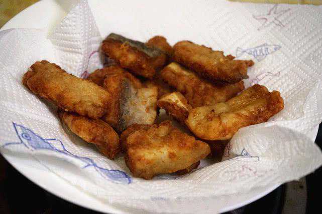 炸鱼的时候要有耐心,一面炸的形状固定再翻面,两面金黄再捞出。