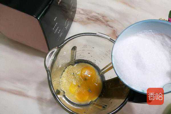 2.把浸泡好的小米倒入破壁机的搅拌杯,(浸泡的水不要倒)两个鸡蛋分离出蛋清和蛋黄,把蛋黄也放入搅拌杯。称取40克细砂糖。
