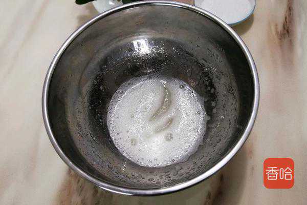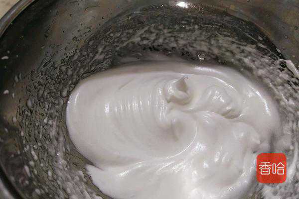 5.破壁机在工作的时候,我们可以打发蛋清了。蛋清内加几滴醋或柠檬汁中和蛋清的PH值,使蛋清容易起泡,用戚风的手法把剩余的糖分三次加入蛋清中进行打发。