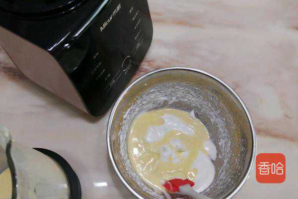 7.把小米糊倒入蛋白霜中翻拌均匀,不能打算搅拌,以免消泡。(翻拌的时候可以预热蒸锅了,把水先烧开)