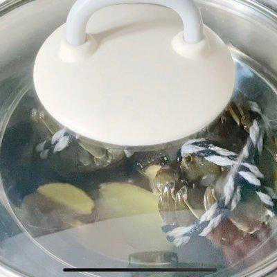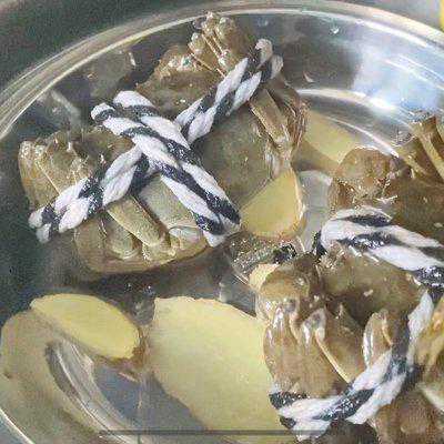 3、盘子里垫姜片垫姜片放上大闸蟹蟹上浇上料酒