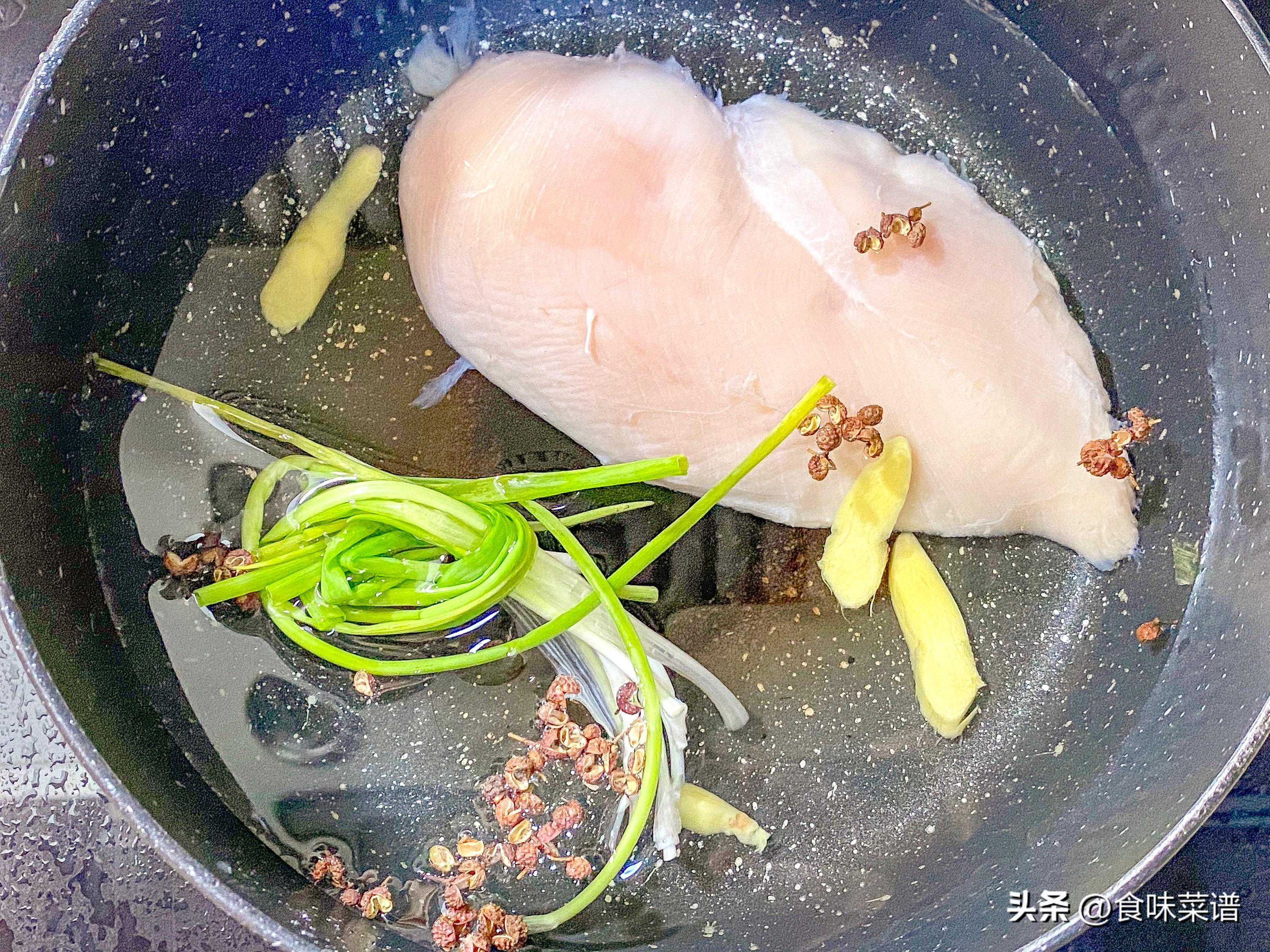 凉拌鸡丝1、准备两块新鲜的鸡胸肉,冲洗干净,放入锅中,加入足量的清水,放入葱姜、花椒和料酒,水开后煮6分钟左右,撇掉浮沫,捞出泡一下凉水,手撕成细丝装盘。