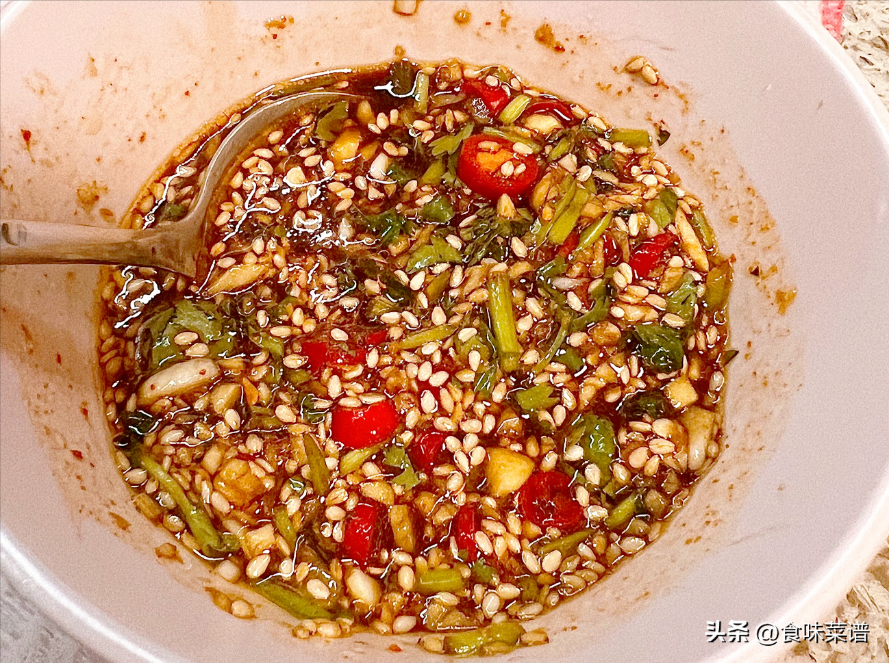 2、简单搭配一个料汁,碗中加入蒜末、小米椒、白芝麻,淋入热油激发出香味,加入调味食盐、白糖、生抽、醋和蚝油,撒一把香菜,搅拌均匀,料汁就制作完成了。