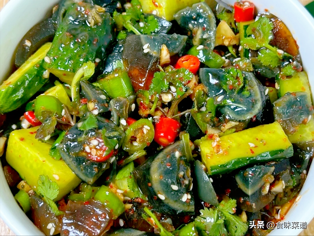 3、把调好的料汁倒入在黄瓜皮蛋中,颠盆翻拌均匀,凉拌皮蛋黄瓜就制作完成了,入口清脆可口,好吃不腻,下酒又下饭,家人都爱吃,不喜欢吃辣的可以不放。