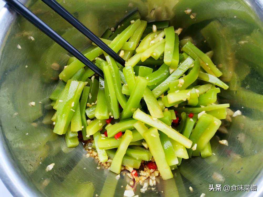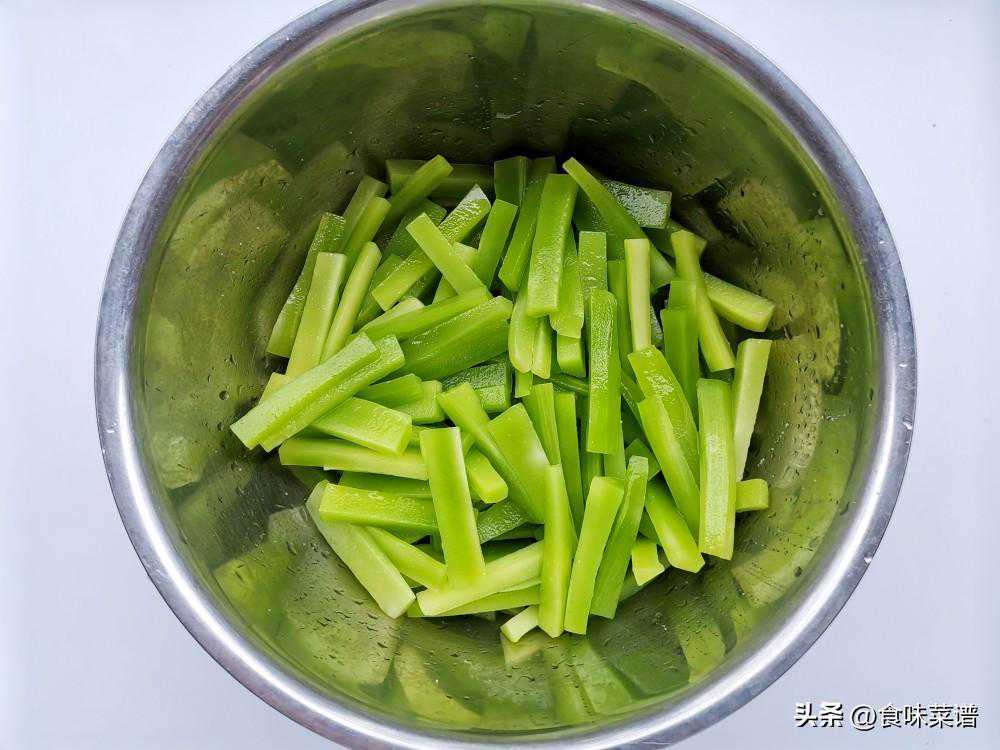 3、天气炎热的时候,最适合端上这么一道开胃小菜了,清脆爽口,营养丰富,越吃越想吃,莴笋可以生吃,如果吃不习惯的话,也可以用提前用开水焯烫两分钟。