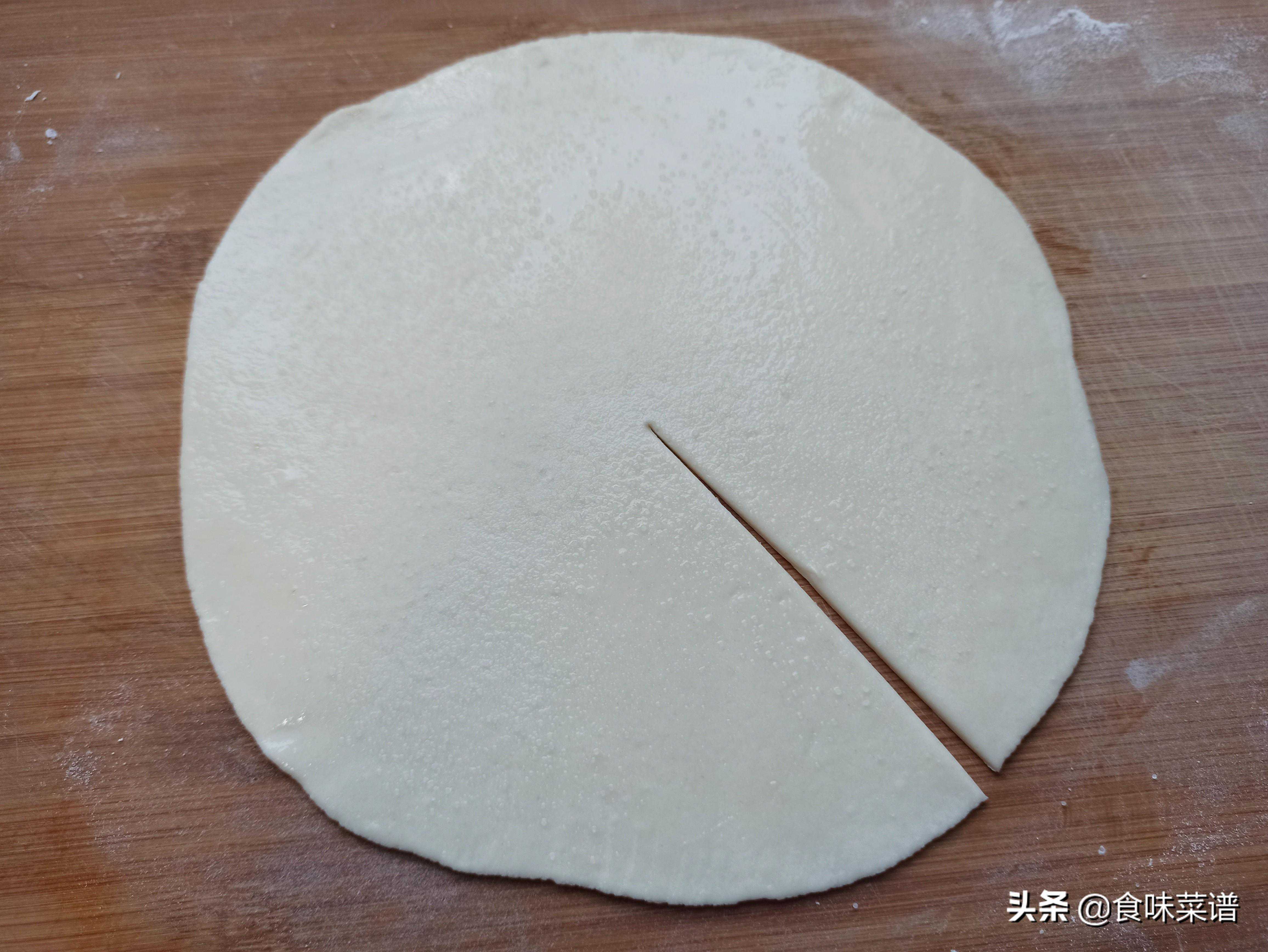 8、取出一个生胚,擀成一张略厚的饼皮,切记不可用力,别把分层压死。