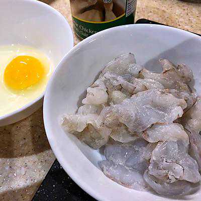 4、加花雕酒、白胡椒粉、蛋清、一撮糖、少许淀粉搅拌至半干,加一点食用油拌匀。保险冷藏待用。(北美厨用酒都含盐)