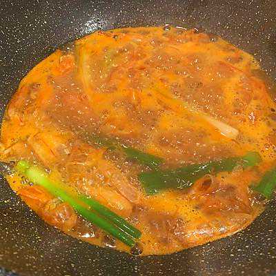 5、虾头、虾壳热油煸炒出红油。加一点花雕酒、葱、姜炒香。