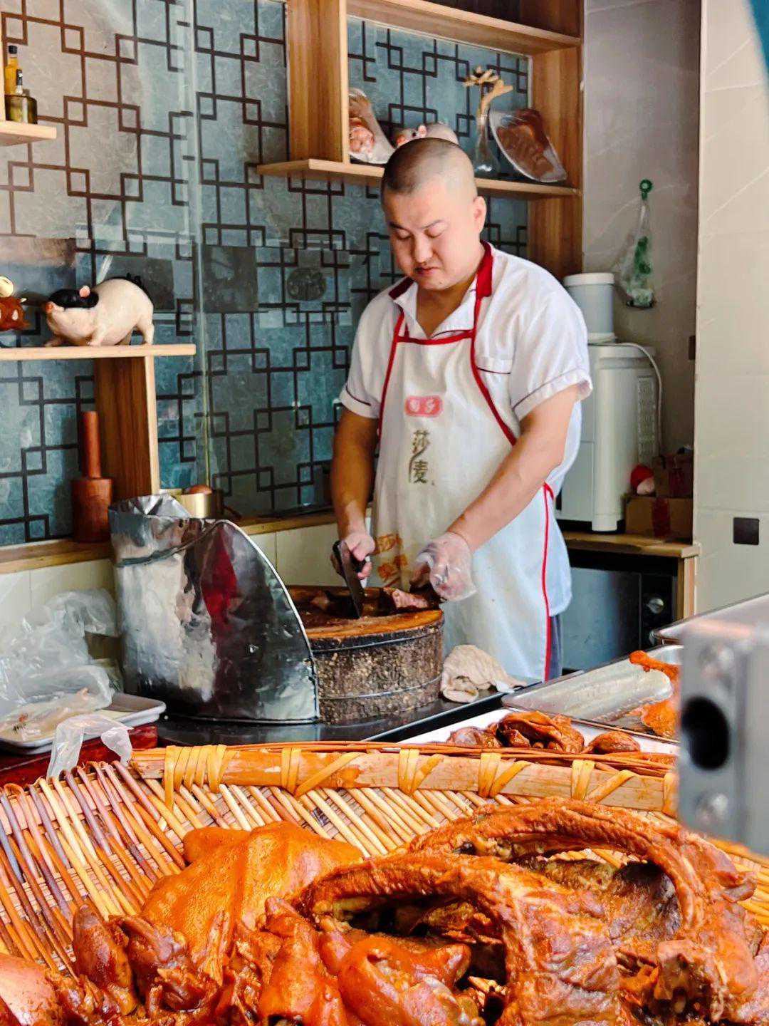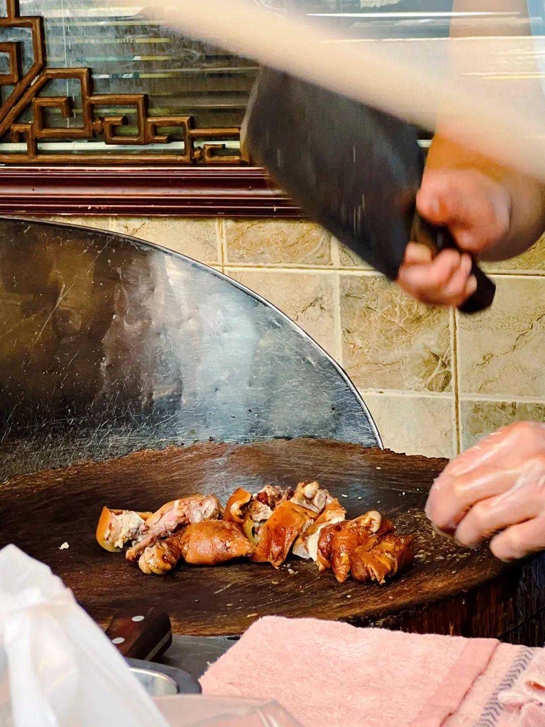 透过反光的玻璃,仔细一看,剁肉的竟然是一个年轻小哥,手法熟练,快而不乱,不知道是不是老卤店的继承人。