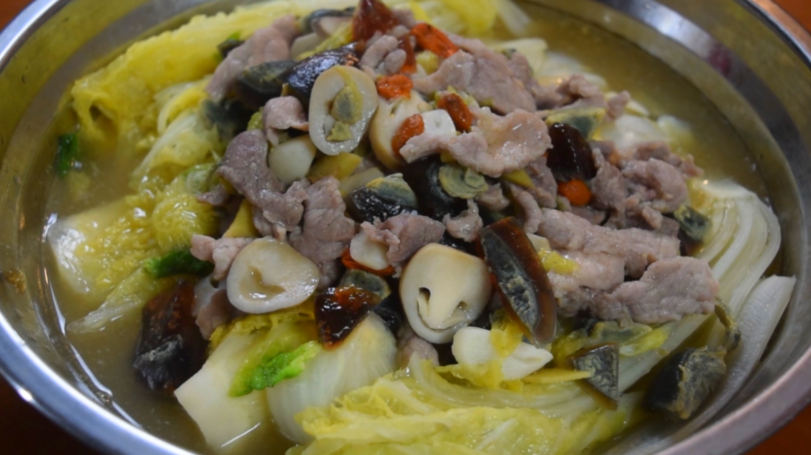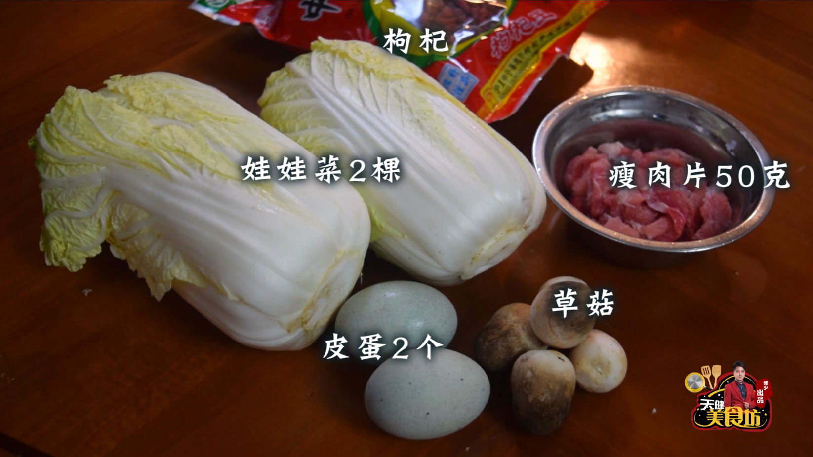 在开始正式制作之前呢,我们首先需要准备以下食材:娃娃菜2颗,皮蛋2个,草菇5个,生姜1块,大蒜3瓣,瘦肉50克,枸杞适量,食盐1茶匙,生抽1汤匙,蚝油1汤匙
