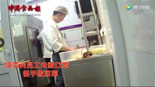 在凉菜间,暗访人员看到,两名员工不但长时间徒手制作凉菜,甚至一次性口罩也从未戴过。