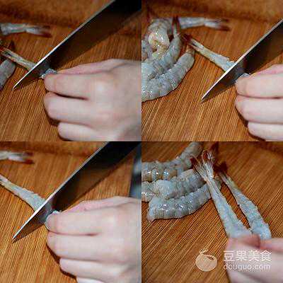 2、大虾洗净去头去壳,留尾.大虾腹部切五刀断筋(不要切段哦,这样炸好的虾是笔直的)
