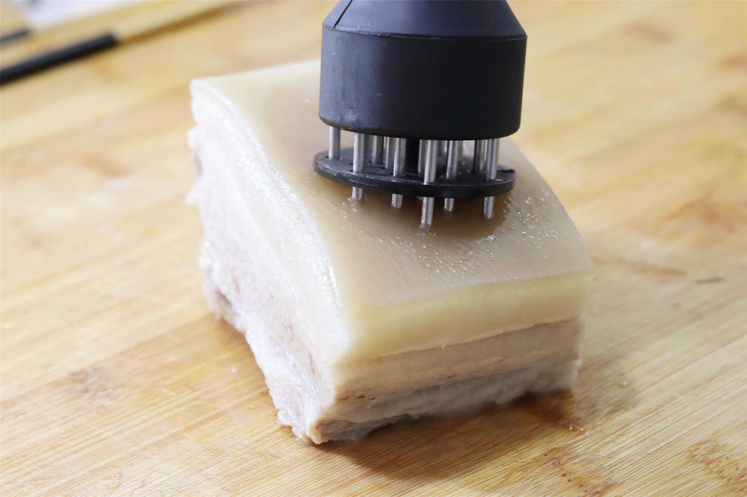 4、五花肉表皮扎孔,尽量扎得密集一些,方便上色和起虎皮。