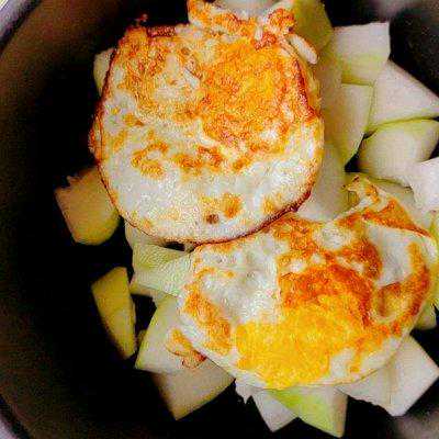 5、然后把冬瓜,鸡蛋放入电饭煲内胆里面!