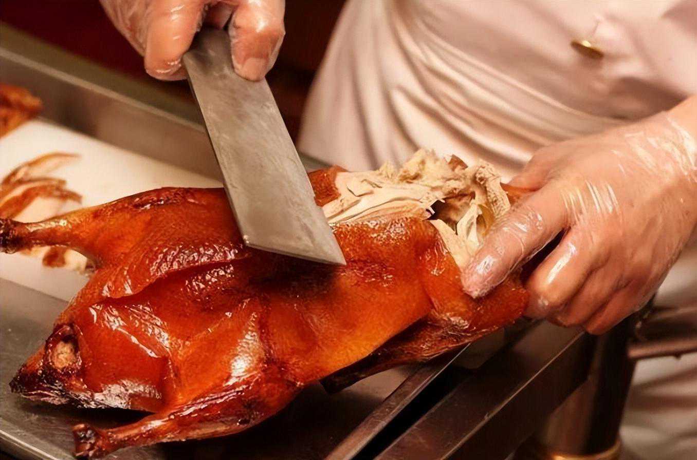 北京鸭经过烤前风干鸭皮等一系列过程,再加上闷炉技术与佐料加持,色泽红里透着嫩白,显得十分诱人。