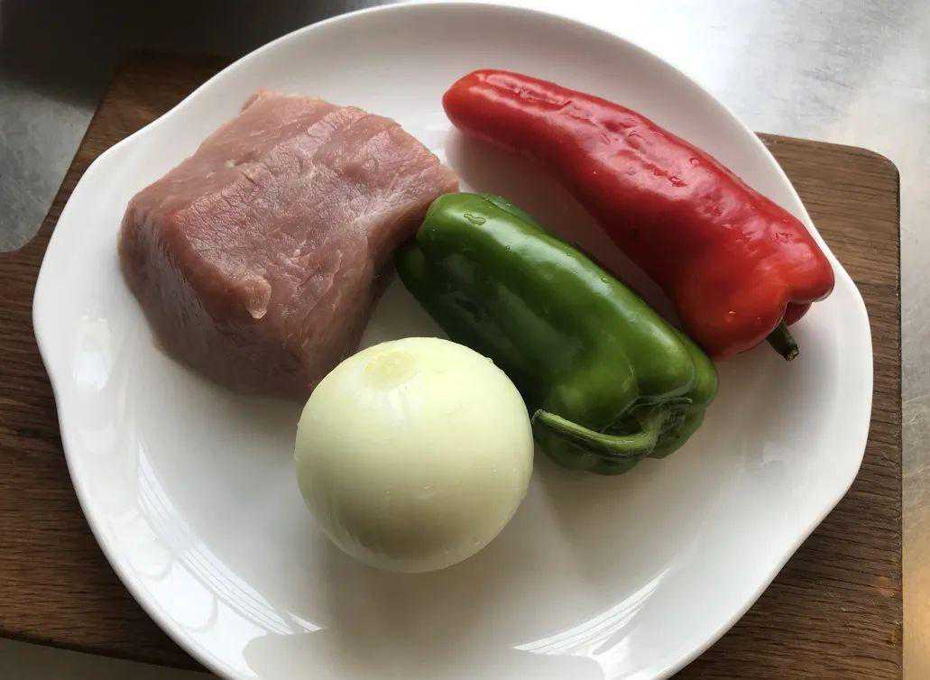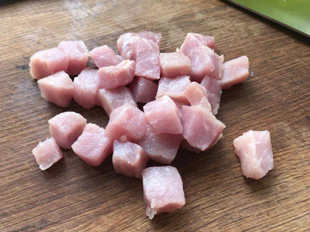 1.猪通脊清洗过后控干水分,切片再切方丁。