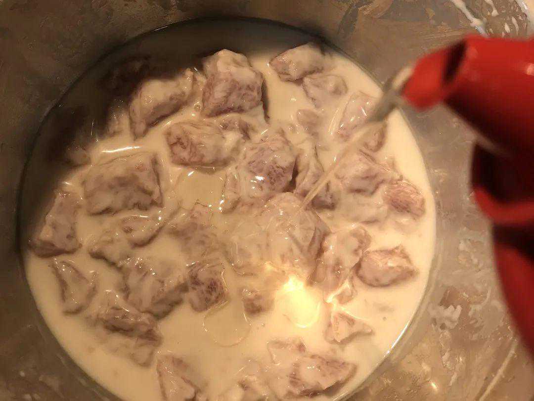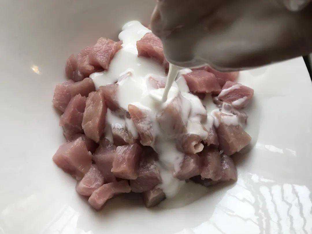 3.淀粉水慢慢加进肉丁抓匀,再加入两大勺植物油拌匀,防止下油锅后肉丁粘连。