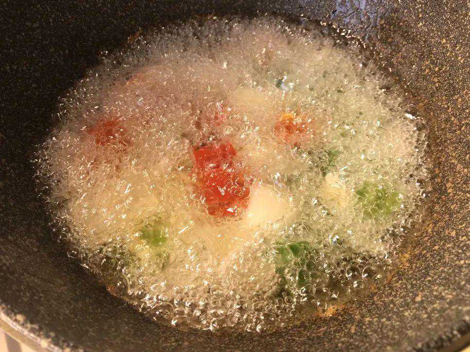 5.青椒、红椒和洋葱切块,放入锅里油炸。