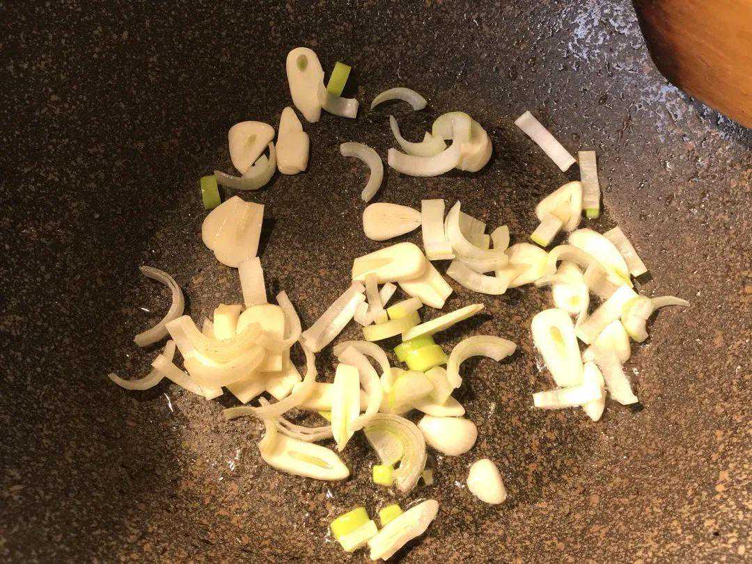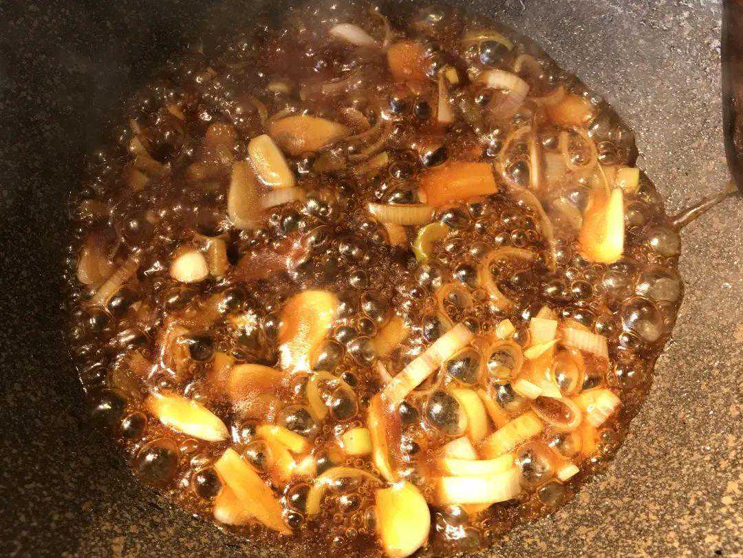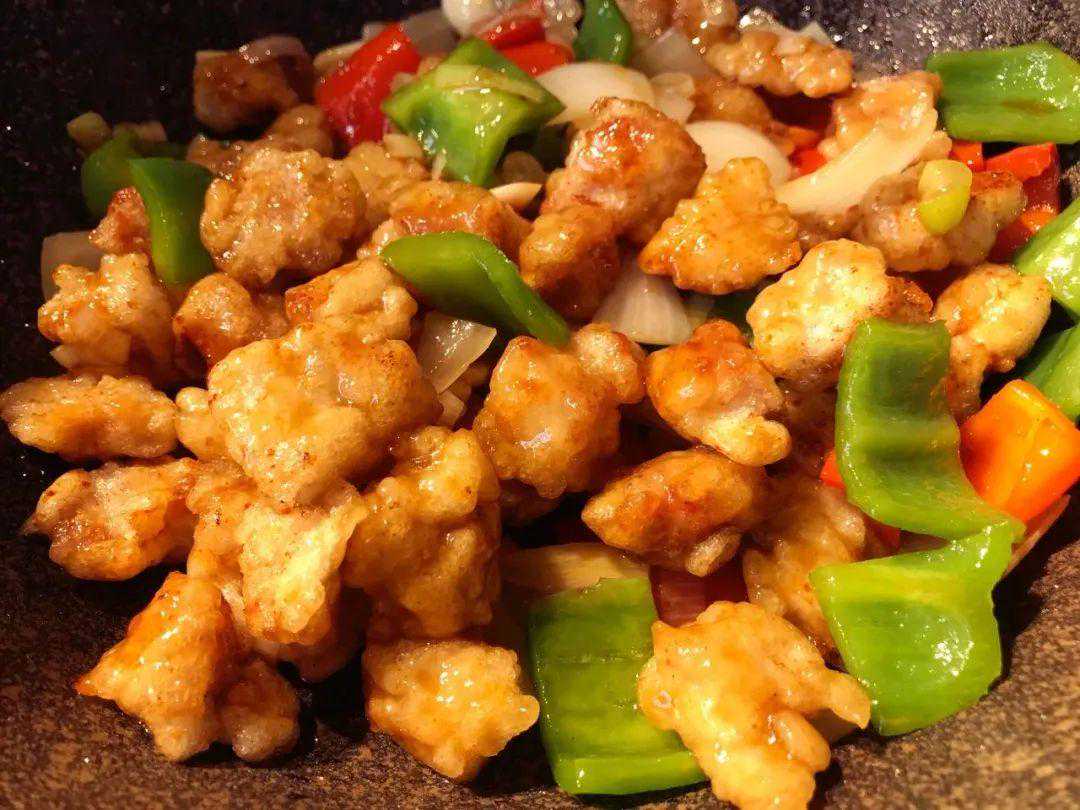 7.葱白切碎大蒜切片,另起锅烧油,油热后将葱花、蒜片下锅爆香,倒入调料汁炒至浓稠。再放入炸好的肉丁和青红椒、洋葱片,炒匀即可出锅。