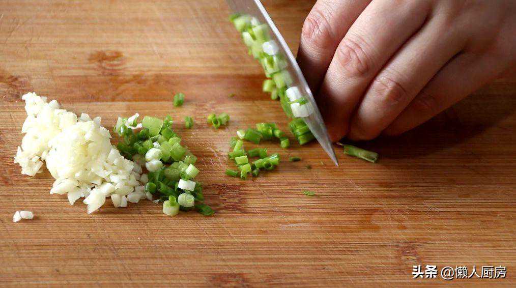 大蒜切末,小葱切末,香菜切小段。