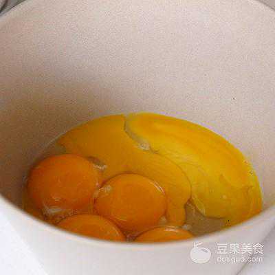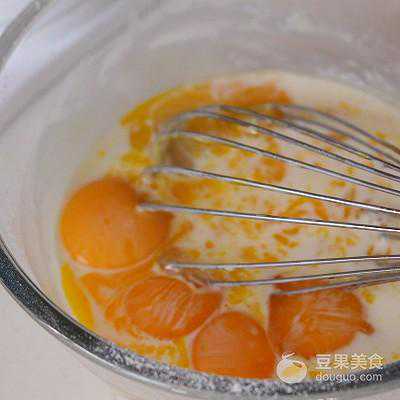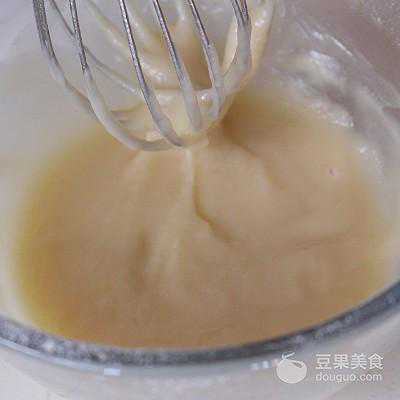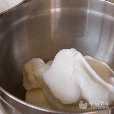 11、打发的蛋清中分三次加入细砂糖,打发至有大弯