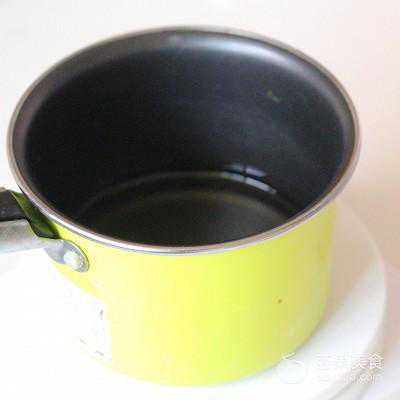 4、玉米油倒入奶锅中,小火加热,至边缘有小泡冒气的时候关火