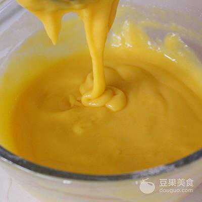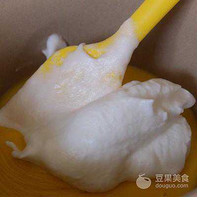 13、其中一份取三分之一跟蛋黄糊搅拌均匀,然后将搅拌均匀的蛋糕糊倒入剩余的蛋白霜中,搅拌均匀