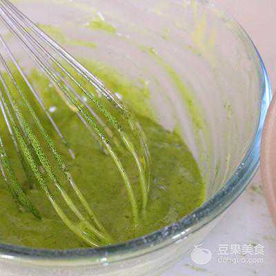 14、另外一份取三分之一跟抹茶蛋黄糊搅拌均匀,然后将搅拌均匀的蛋糕糊倒入剩余的蛋白霜中,搅拌均匀