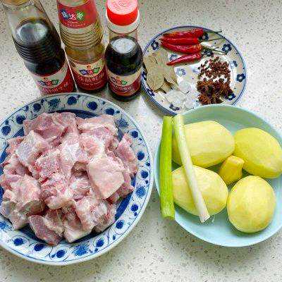 1、准备好所用的食材,排骨冷水浸泡洗净血水,土豆削皮洗净,配料装盘备好。