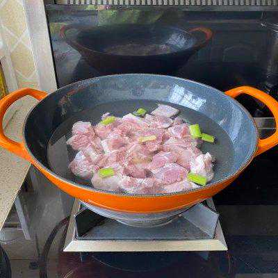 2、锅里加入清水,放入葱段姜片和料酒,下入排骨一起大火煮沸。