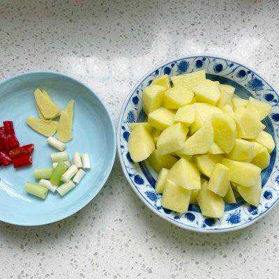 3、把大葱切段,生姜切片,红辣椒切成段,土豆切成滚刀块清水洗干净淀粉,捞出装盘备用。